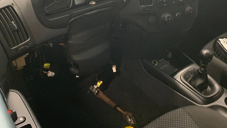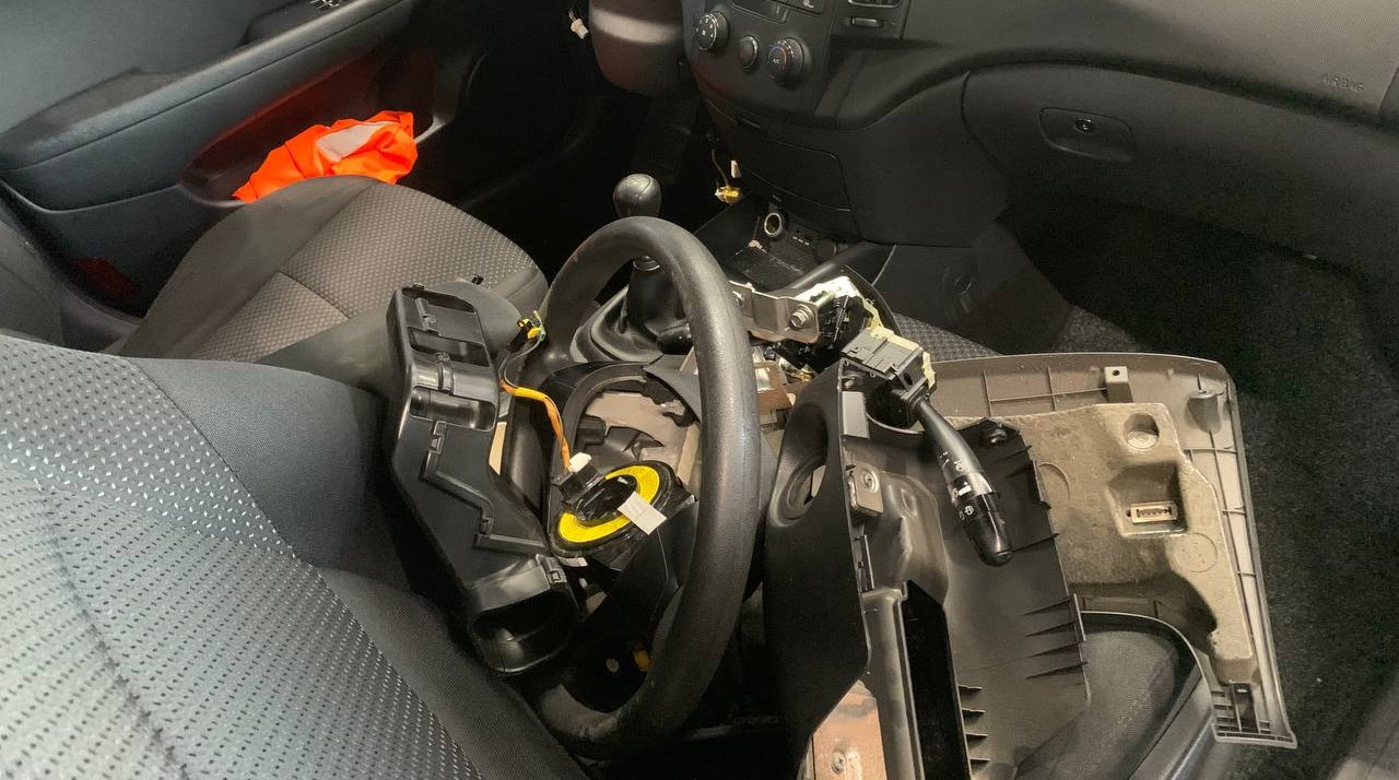 During the repair process, we had to remove the steering wheel and partially dismantle the interior trim to assess the condition of the internal components. The photo of the interior without the steering wheel clearly shows the extent of the repair work.
