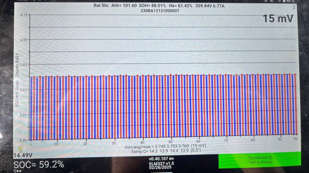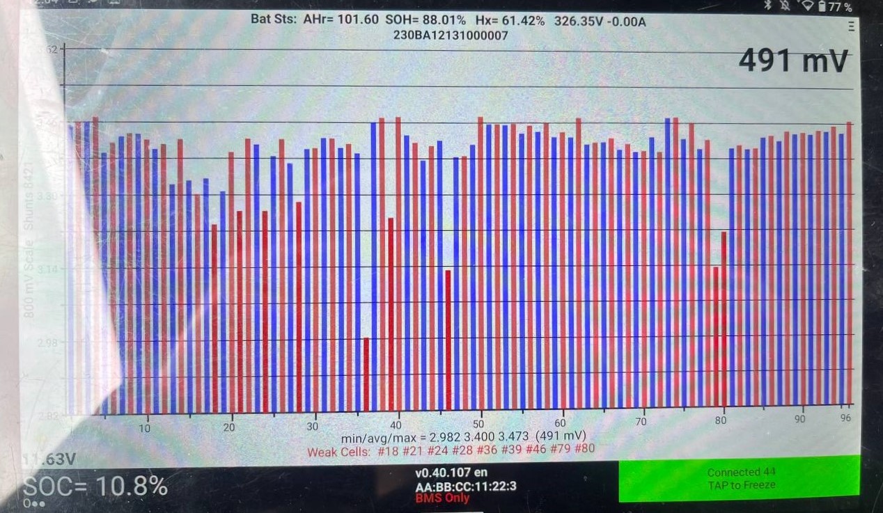 Nous avons remplacé ces trois cellules et rééquilibré la batterie. Au final, l'écart entre les modules n'était que de 15 mV, ce qui est un excellent résultat. Nous avons ensuite installé la batterie sur le véhicule et l'avons testée sous charge.