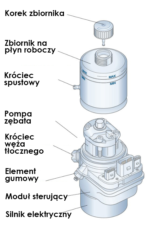 Pompa jest połączona z mechanizmem kierowniczym za pomocą specjalnych węży spustowych. Podobnie jak w konwencjonalnym układzie hydraulicznym, przewód spustowy jest podłączony do zbiornika wyrównawczego. W komorze silnika pompa jest przymocowana do wspornika, który jest zwykle przymocowany do elementu nośnego nadwozia lub ramy za pomocą sprężystych elementów gumowych.