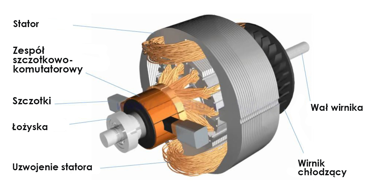 - zużycie lub uszkodzenie części silnika elektrycznego: szczotek, uzwojeń, kolektora;