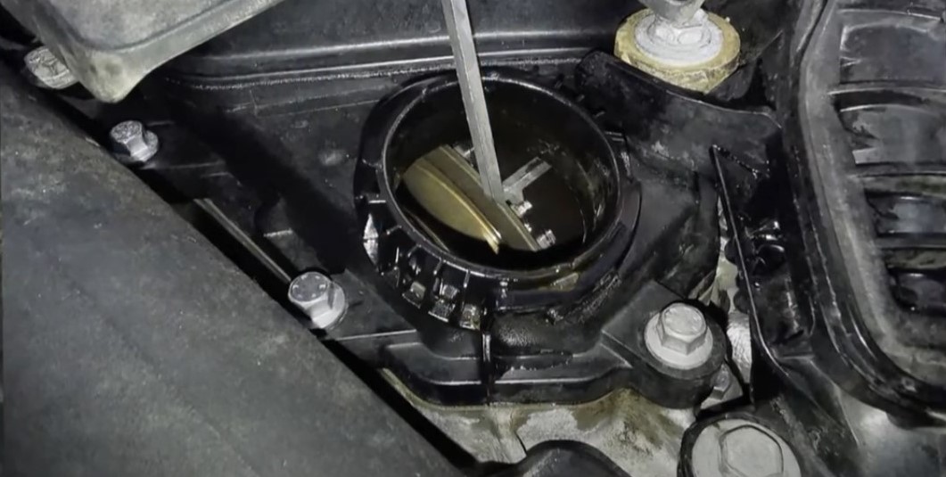Przyczyna problemu: zatkanie siatki odbiorczej pompy olejowej produktami rozkładu paska rozrządu. Kawałki gumy prawie całkowicie blokowały dopływ oleju.