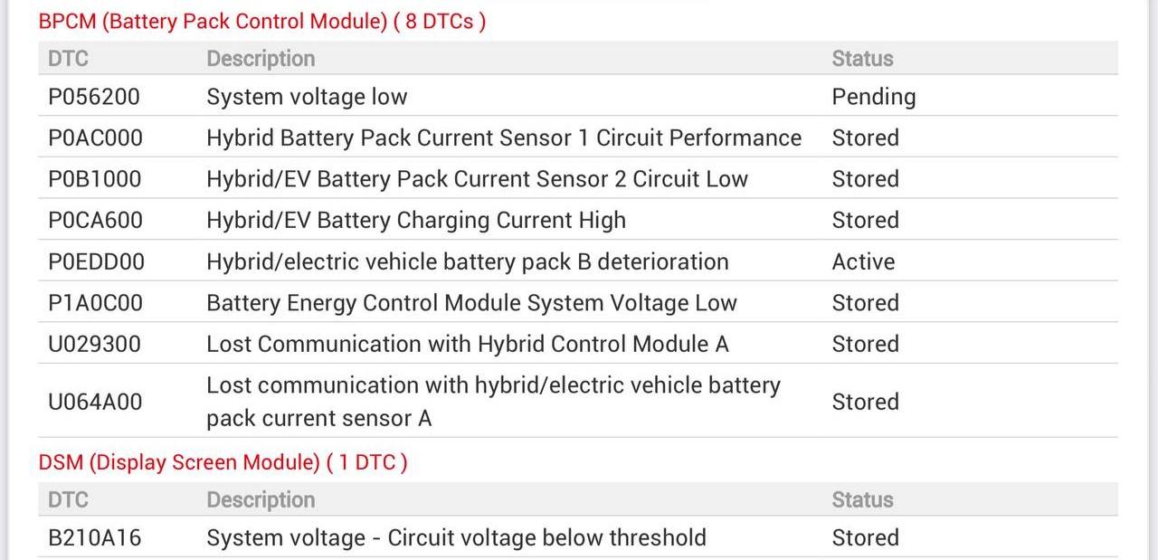Такой набор кодов неисправностей типичен для ситуаций, когда высоковольтная батарея находится в состоянии глубокого разряда, а система управления батареей переходит в защитный режим и блокирует работу электромобиля.